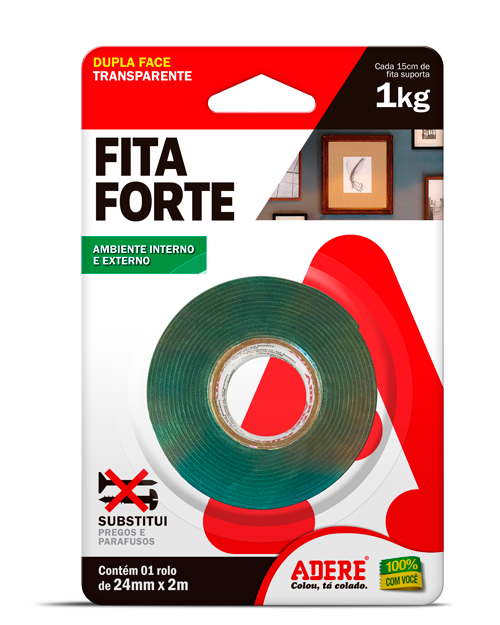 A linha de fitas dupla face Fita Forte é exemplo disso. Com fácil aplicação e fixação extraforte, atendem as mais diversas necessidades do dia a dia com 5 diferentes modelos, incluindo o formato tab. Indicadas para fixação de acrílicos, vidros, quadros, objetos de decoração, canaletas plásticas, placas de identificação e sinalização, sua linha também pode ser usada em comunicação visual, além dos setores de decoração e construção, uma vez que os produtos atendem aplicações em ambiente interno e externo e garantem fixação extraforte e permanente.
