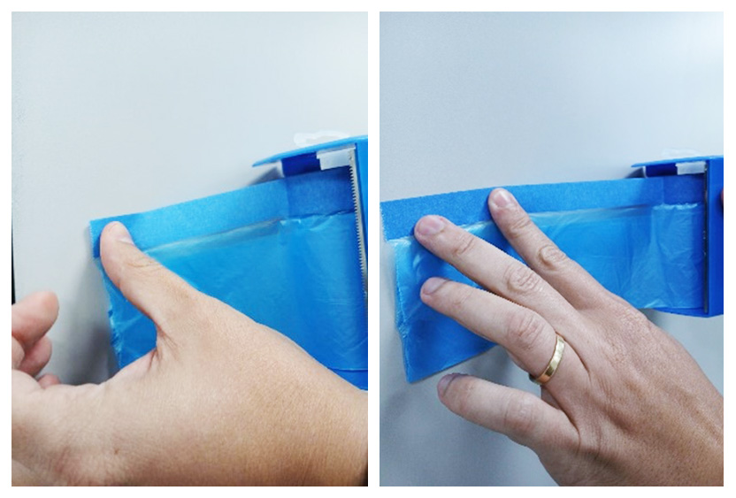 Puxe a fita (não o filme) para desenrolar o rolo e posicione-a na borda da área que deseja proteger.